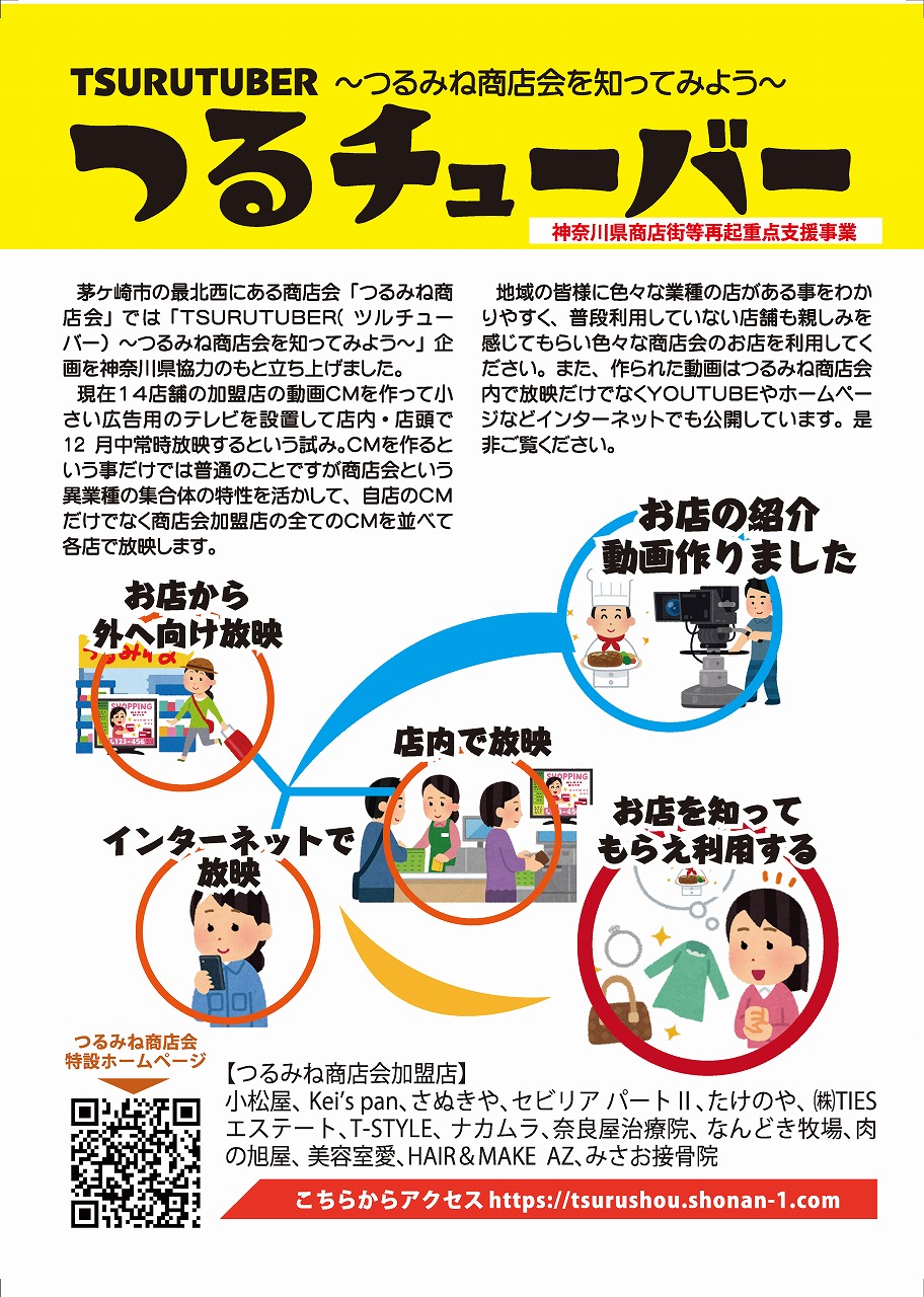 茅ヶ崎市の最北西にある商店会「つるみね商店会」では「TSURUTUBER(ツルチューバー)~つるみね商店会を知ってみよう~」企画を神奈川県協力のもと立ち上げました。 現在14店舗の加盟店の動画CMを作って小さい広告用のテレビを設置して店内・店頭で12月中常時放映するという試み。CMを作るという事だけでは普通のことですが商店会という異業種の集合体の特性を活かして、自店のCMだけでなく商店会加盟店の全てのCMを並べて各店で放映します。 地域の皆様に色々な業種の店がある事をわかりやすく、普段利用していない店舗も親しみを感じてもらい色々な商店会のお店を利用してください。 また、作られた動画はつるみね商店会内で放映だけでなくYOUTUBEやホームページなどインターネットでも公開しています。是非ご覧ください。